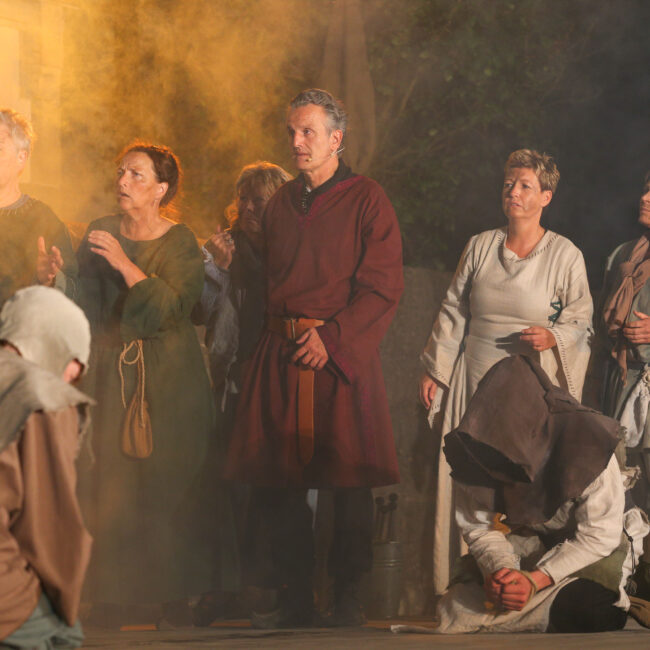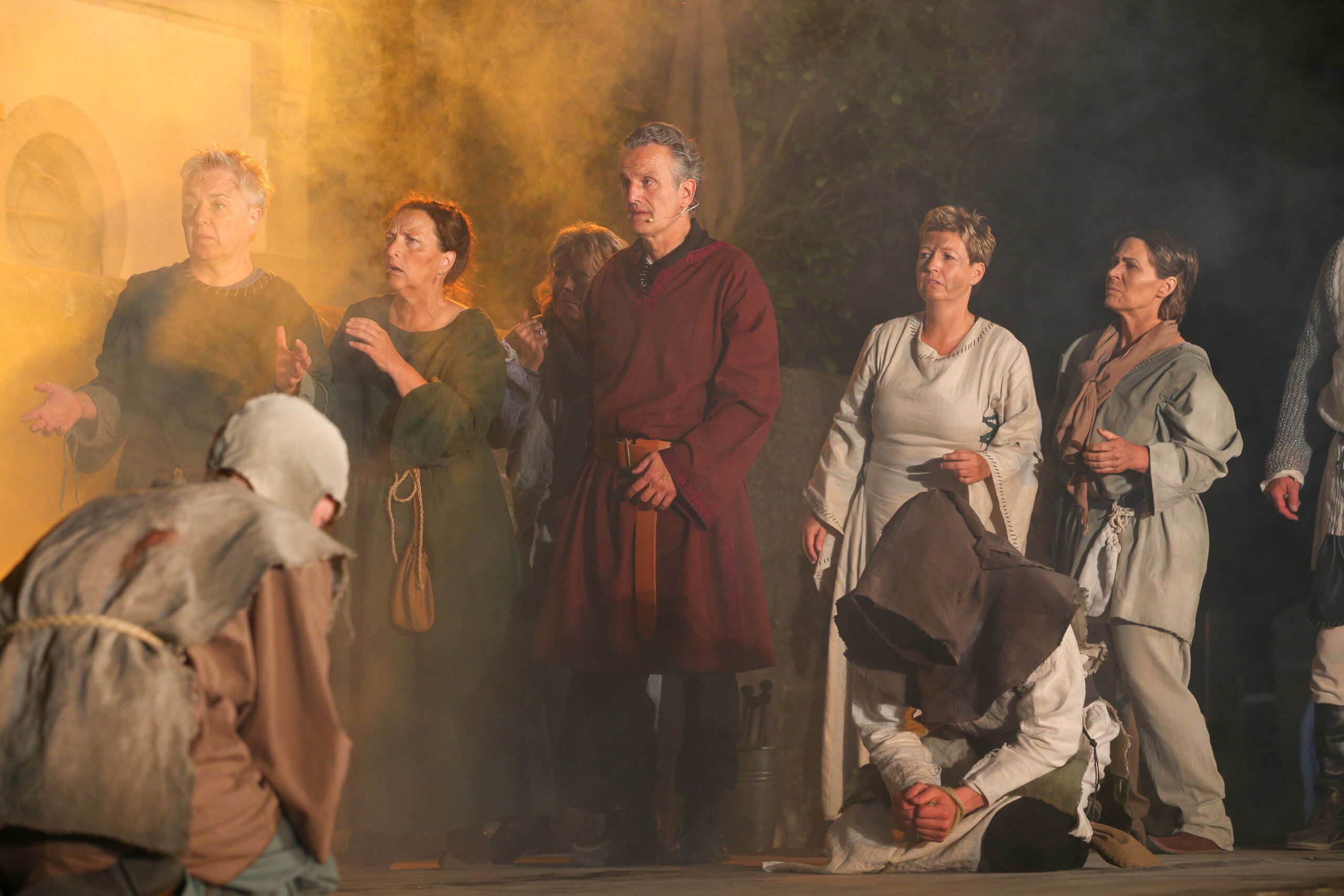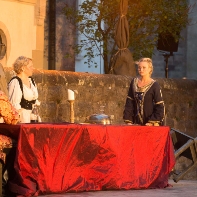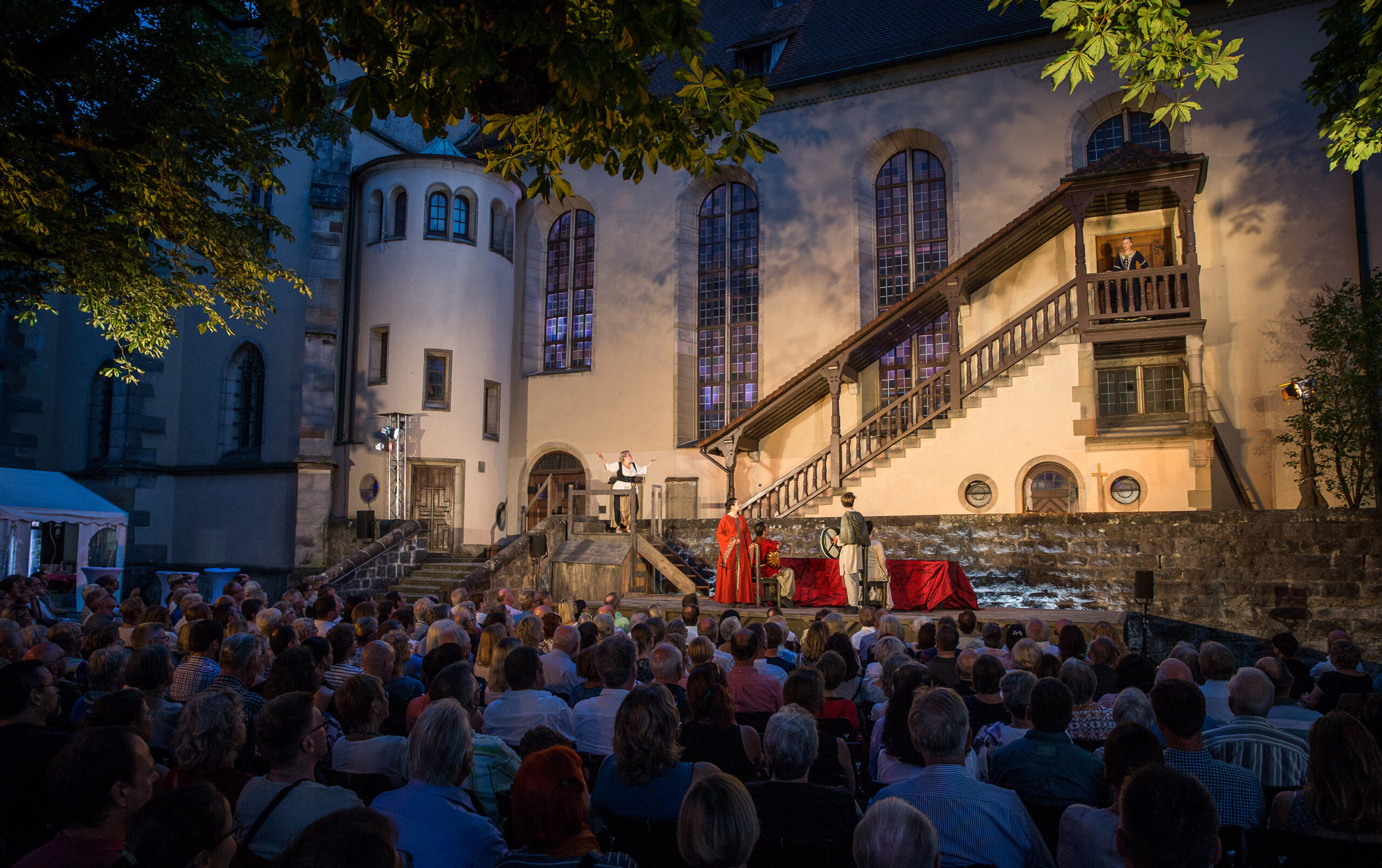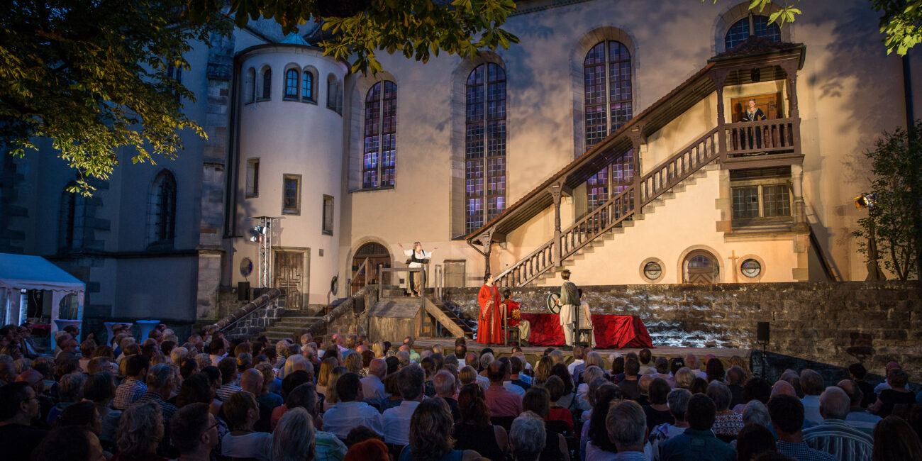 Die Geschichte führt ins Mittelalter und kommt doch in der Gegenwart heraus: „Judith von Backnang“ erzählt die fiktive Geschichte einer realen historischen Figur, die im 12. Jahrhundert gelebt und dasjenige Kirchenstift gegründet hat, vor dem das Freilichtstück aufgeführt wurde. Es ging um eine junge Frau auf der Suche zwischen Liebe und Moral, um ihre politische Funktion als Friedensbringerin in einer Ehe, die ehemals verfeindete Gruppen im Heiligen Römischen Reich Deutscher Nation zusammenbringen sollte und um durch und durch intrigante Instanzen, die genau das verhindern wollten. Es wird erzählt, wie Ideologie Persönlichkeit attackiert – und ob es im Fall des Markgrafen von Baden, Judiths Mann, zusammenpasst, Christ zu sein und zugleich Machthaber und Krieger. Eine von damals bis heute geführte Debatte. Gespiegelt werden all diese Fragen auf einer komödiantischen Ebene durch das Dienerpaar Bertschi und Lieblinde.
