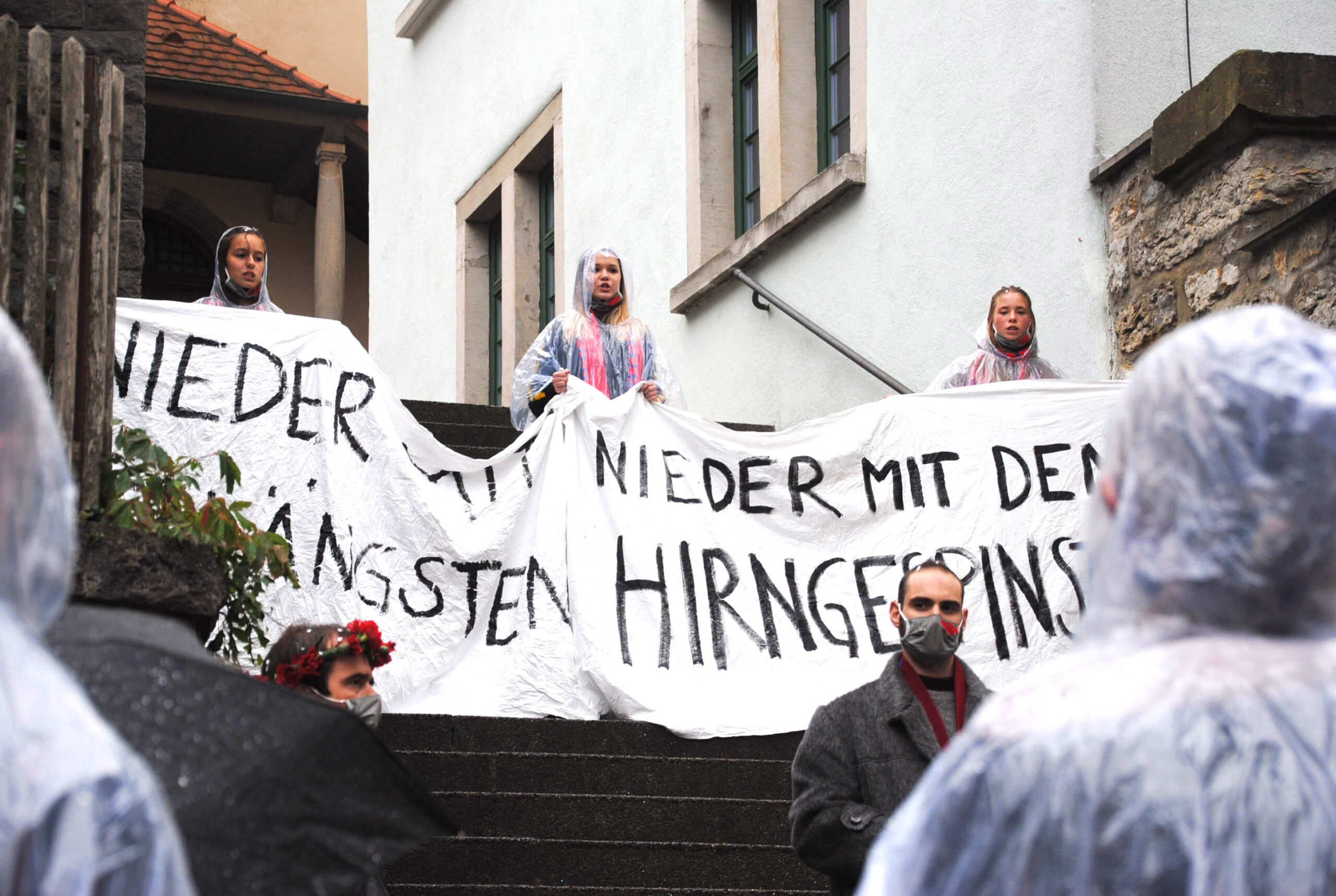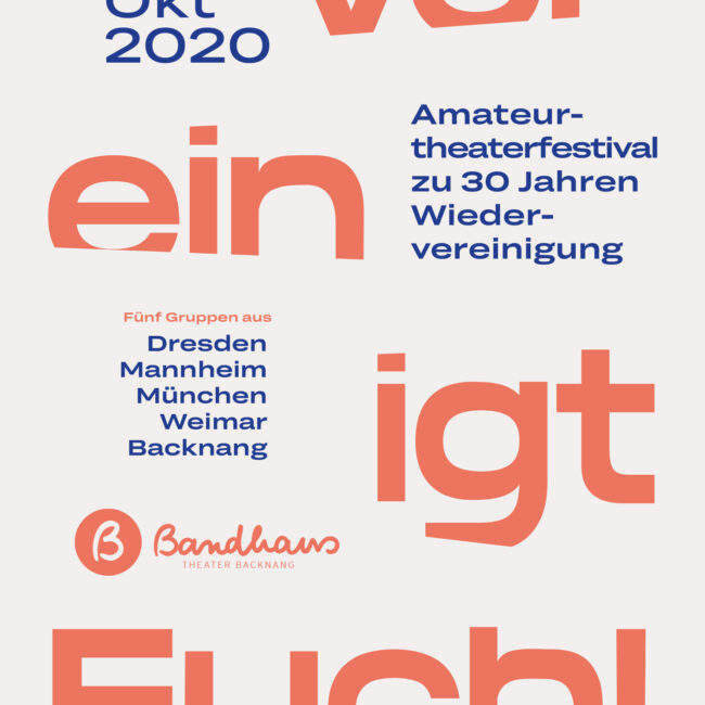 Eigentlich mitten in der Corona-Zeit, aber mit dem richtigen Gespür für das richtige Zeitfenster, hat das Bandhaus Theater Backnang mit großem Pragmatismus und in einer enormen Energieleistung ein Amateurtheater-Festival ermöglicht, bei dem unter dem Titel „Vereinigt euch!“ vom 1. bis zum 4. Oktober 2020 fünf Theatergruppen aus dem Osten und dem Westen zusammengekommen sind. Anlass des Theatertreffens mit rund 100 Beteiligten zwischen 14 und 80 Jahren mit Vorstellungen und Workshops unter strengen Hygiene-Bedingungen war das Jubiläum von 30 Jahren Wiedervereinigung – wie sich zeigte, die einzige Veranstaltung dazu in Stadt und Region. Unser Credo war, dass es ja nichts nutzt, sich hinzusetzen, zu beklagen oder zu resignieren, sondern mit den Möglichkeiten produktiv und kreativ umzugehen, die sich einem trotz allem bieten. Es war erstaunlich, wie sich auf den örtlichen Bühnen und in einem zentralen Bierzelt Ost und West austauschten – und wie viel Austausch noch nötig war und ist. Theater, so hat sich erwiesen, ist eine wunderbare Bühne für solchen Austausch und das Eintauchen in andere Lebenswelten und Lebenswirklichkeiten.